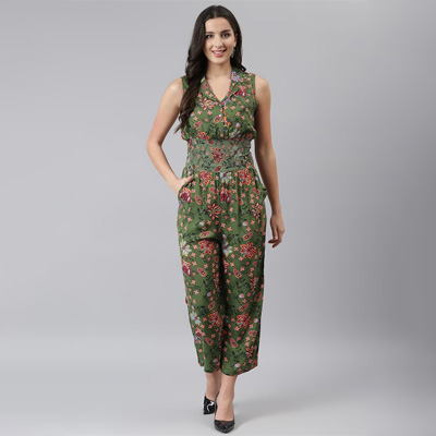 Olive Green & Red Printed Culotte Jumpsuit