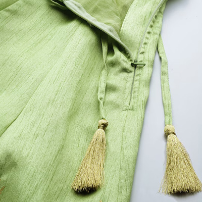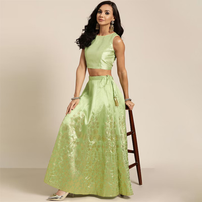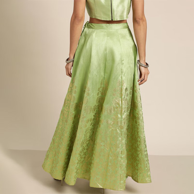"Green woven design foil print flared skirt, has a zip and drawstring closure, and flared hem Size & Fit The model (height 5'8'') is wearing a size 28 Material & Care Poly Silk Dry-clean"