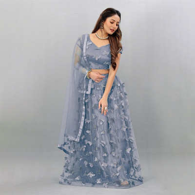 "Lehenga Fabric: Net Blouse Fabric : Net Dupatta Fabric : Net Lehenga Lining Fabric : Raw Silk Lehenga Closure : Drawstring Hemline : Flared Neck : Round Neck Sleeve Length : Short Sleeves"