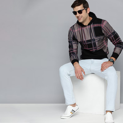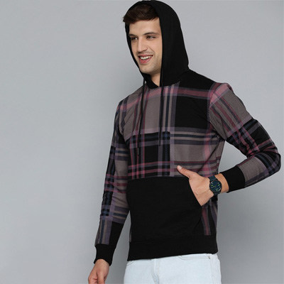 "Black checked sweatshirt has a hood, 1 kangaroo pocket, long sleeves, ribbed hem Size & Fit The model (height 6') is wearing a size M Material & Care 60% cotton and 40% polyester Machine wash"