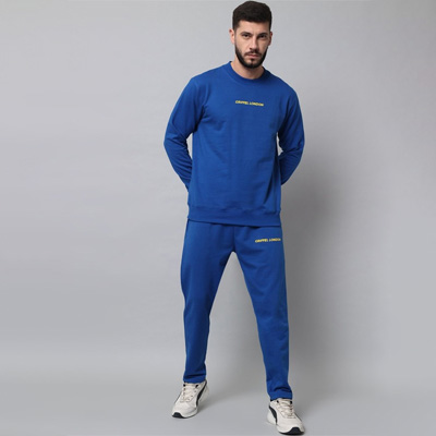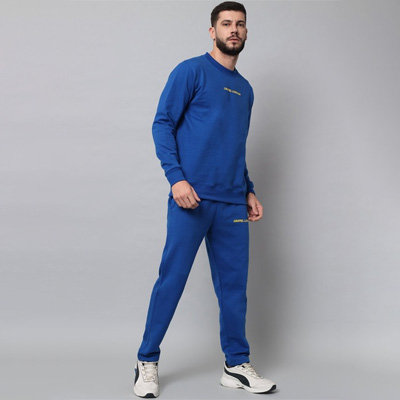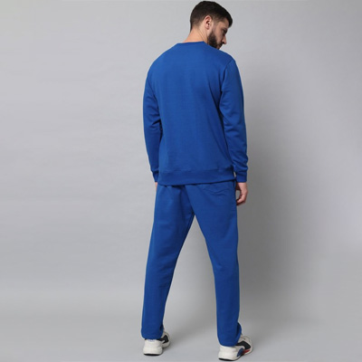 "Blue solid tracksuit Blue solid sweatshirt, has a round neck, long sleeves with ribbed cuffs, slip-on closure and two pockets Blue solid mid-rise track pants, has an elasticated waistband with drawstring closure and two pockets Size & Fit The model (height 6') is wearing a size M Material & Care Fleece Cotton Machine Wash"
