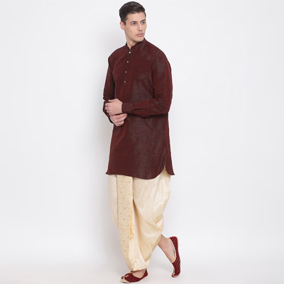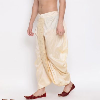 "Gold-Coloured solid traditional readymade dhoti, has a gold-coloured border with intricate embroidery detailing and drawstring closure Size & Fit The model (height 6') is wearing a size M Material & Care Silk-Blend Dry Clean preferably or cold light wash"