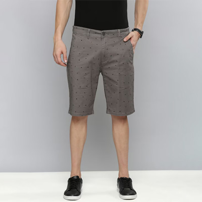 "Grey printed mid-rise regular shorts, has 4 pockets, button closure