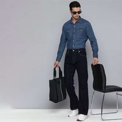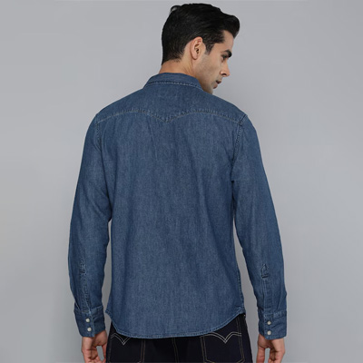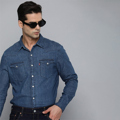 "Blue solid opaque Casual shirt ,has a spread collar, snap button placket, 2 patch pocket, long regular sleeves, curved hem Fit: Slim Fit Size worn by the model: M Chest: 38"" Height: 6'1"" Material & Care 100% Cotton, Machine-wash"