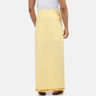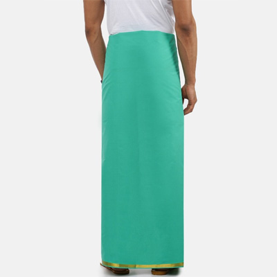 "Pack of 2 dhoti Green solid dhoti has gold zari border Beige solid dhoti has gold zari border Size & Fit Dimension of dhoti: 1.27 m x 2 m(Length x Width) Material & Care 100%Cotton Machine wash"