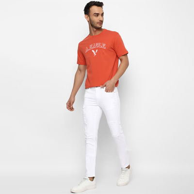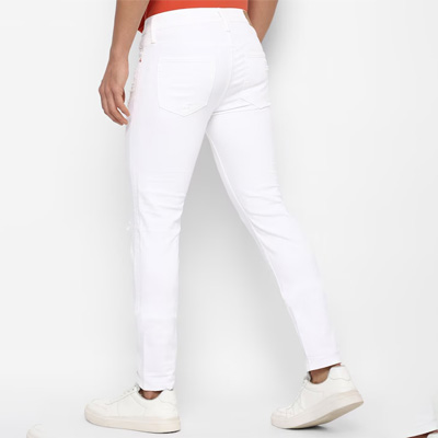"Light shade, no fade jeans Slim fit, mid-rise Mildly distressed Non stretchable 5 pocket Length: cropped Size & Fit Fit: Slim Fit The model (height 6') is wearing a size 32 Material & Care 92% Cotton, 6% Polyester T400 and 2% Lycra Machine Wash"