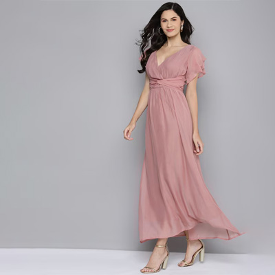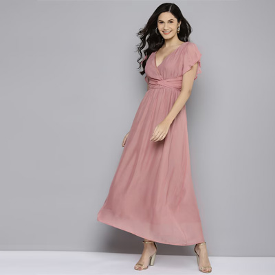 "Pink solid maxi dress V-neck Short, flared sleeve Maxi length in flared hem Zip closure Size & Fit The model (height 5'8) is wearing a size S Material & Care 100% Polyester Machine wash"