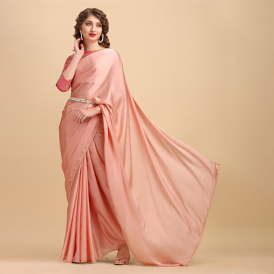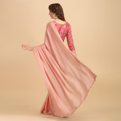"Rose saree Solid saree with embellished border Has embroidered detail The saree comes with an unstitched blouse piece The blouse worn by the model might be for modelling purpose only. Check the image of the blouse piece to understand how the actual blouse piece looks like. Size & Fit Length: 5.5 metres plus 0.8 metre blouse piece Width: 1.06 metres (approx.) Material & Care Saree fabric: Satin Blouse fabric: Silk Cotton Dry Clean"