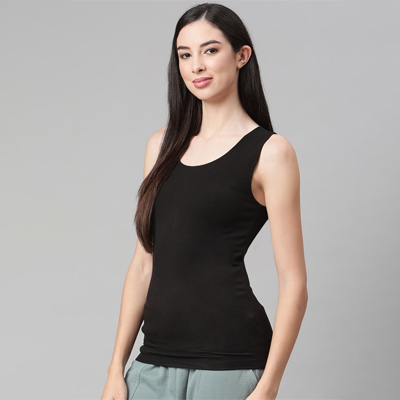 "Black solid thermal top, has no sleeves and scoop neck Material & Care 64% acrylic, 28% viscose and 8% elastane Machine wash"