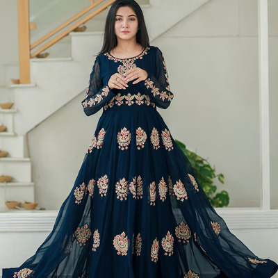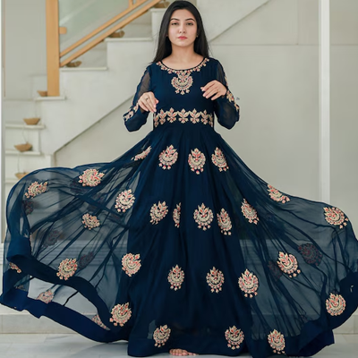 "Set Content:Gown Fabric Kurta Pattern:Embroidered Print or Pattern Type:Ethnic Motifs Occasion;Fusion Wash Care:Dry Clean Kurta Fabric:Poly Georgette Stitch:Semi-Stitched"