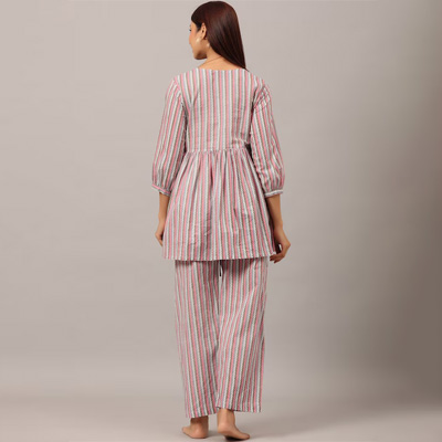 "Striped printed Anarkali shape Regular style Round neck, three-quarter puffed sleeves 1 pockets Above knee length with flared hem Pure cotton machine weave fabric Trousers design: Printed Trousers Drawstring closure Size & Fit The model (height 5'8) is wearing a size S Material & Care Kurta material: 100% cotton Trouser material: 100% cotton Machine wash"
