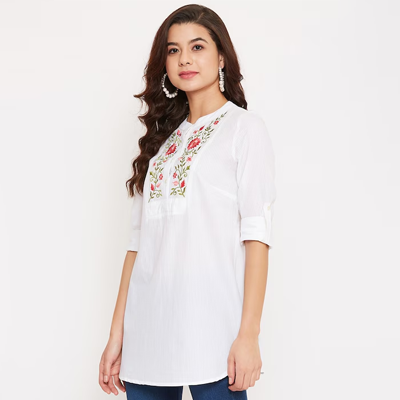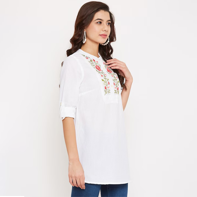 "White and red embroidered tunic has a mandarin collar, long sleeves, embroidered detail, and button closure Size & Fit The model (height 5'8) is wearing a size S Material & Care Cotton Machine wash"