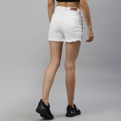 "White abstract printed high-rise outdoor hot pants, has 4 pockets, button closure Size & Fit Slim Fit The model (height 5'8) is wearing a size 28 Material & Care denim machine wash Wash dark colour separately do not bleach warm iron if needed"