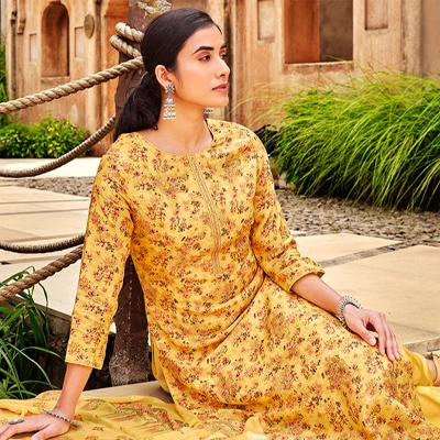 "Yellow and pink printed unstitched dress material Yellow and pink printed kurta fabric Yellow and pink solid bottom fabric Yellow and pink printed dupatta, has solid border Disclaimer: Images are for referral purposes only. The actual product is unstitched Size & Fit Top: 3 Mtr., Bottom: 2.90 Mtr., Dupatta: 2.25 Mtr. Material & Care Kurta & Bottom:Pure silk Dupatta:Chiffon Dry Clean Only"