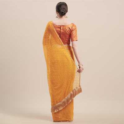 "Yellow embellished saree and has a zari border Blouse Piece The model is wearing a stitched version of the blouse piece. The saree comes with an unstitched blouse piece. Size & Fit Length: 5.5 metres plus 0.8 metre blouse piece Width: 1.06 metres (approx) Material & Care Saree fabric: poly georgette Blouse fabric: brocade Dry-clean"