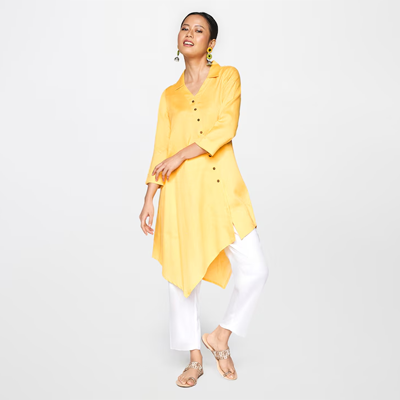 "Yellow solid tunic ,has a shirt collar, three-quarter sleeves, and asymmetric hem Size & Fit The model (height 5'8) is wearing a size S Material & Care 55% viscose 35% cotton 10% flex Machine wash"