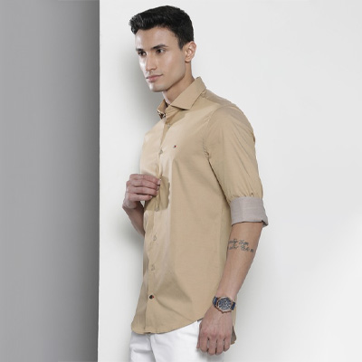 "Tan brown solid opaque twill smart casual shirt, has a cutaway collar, button placket, long regular sleeves, curved hem Size & Fit Size worn by the model: 40 Chest: 39"" Height: 6'3"" Material & Care 83% cotton, 14% lyocell and 3% elastane Machine wash"