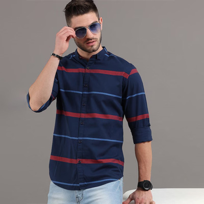 "Blue horizontal stripes striped opaque Casual shirt ,has a spread collar, button placket, long regular sleeves, curved hem Size & Fit Fit: Slim Fit The model (height 6') is wearing a size 40 Material & Care Cotton Machine wash"