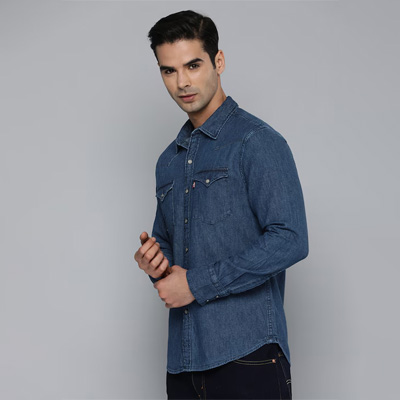 "Blue solid opaque Casual shirt ,has a spread collar, snap button placket, 2 patch pocket, long regular sleeves, curved hem Fit: Slim Fit Size worn by the model: M Chest: 38"" Height: 6'1"" Material & Care 100% Cotton, Machine-wash"