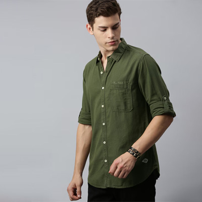 "Olive Green solid casual shirt, has a spread collar, long sleeves, button placket, curved hem, and 1 patch pocket Size & Fit Regular Fit The model (height 6') is wearing a size 40 Material & Care Material: 100% cotton Machine Wash"